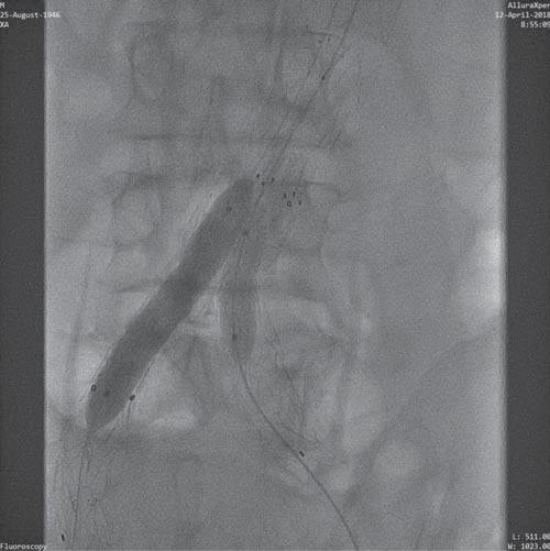 Given the heighten surgical risk, but mainly the pa-tients’ preference, a decision was taken for endovascular repair with the mounting of an aorto-biiliac stent graft, procedure performed in another clinic. Pre-procedural, the difficulty posed by the anatomic particularities of the case was acknowledged (aneurysm neck angulation, kinking and bilateral calcifications of the iliac arteries, aortic proximal angle of 120°), with high risk de periprocedural complications and possibly graft limb occlusion. An E-Tegra® system (Jotec Gbmh) stent graft was implanted, with bilateral iliac extensions, of 19 mm proximal and 15 mm distal diameters. The main body prosthesis was deployed through right femoral aboard. The control injection after stent graft implantation showed a type I endoleak proximally, solved through balloon post dilatation.
